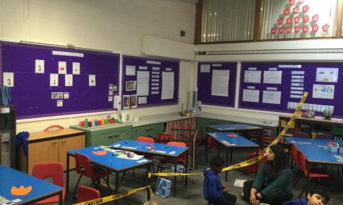 Today we came into school to find our classroom had been destroyed and was now a crime scene! We had to work together to investigate what could have happened, who might have done this and why. We looked for clues such as big footprints. Finally, we looked at pictures from our new story in our huddles and wrote down what we could see.